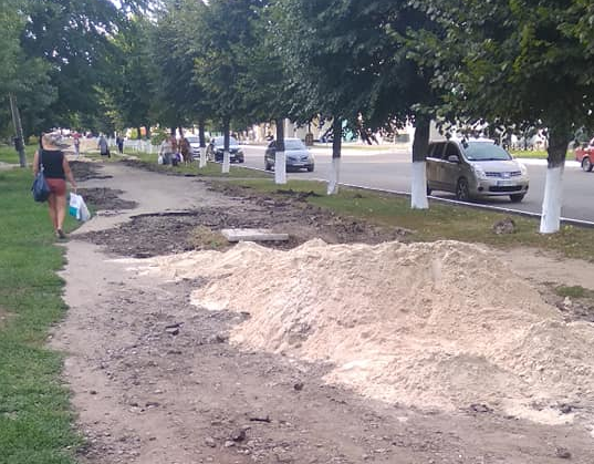 В Лисичанске на проспекте Победы напротив "Ощадбанка" невозможно пройти по тротуару: он весь перерыт, насыпаны кучи песка.