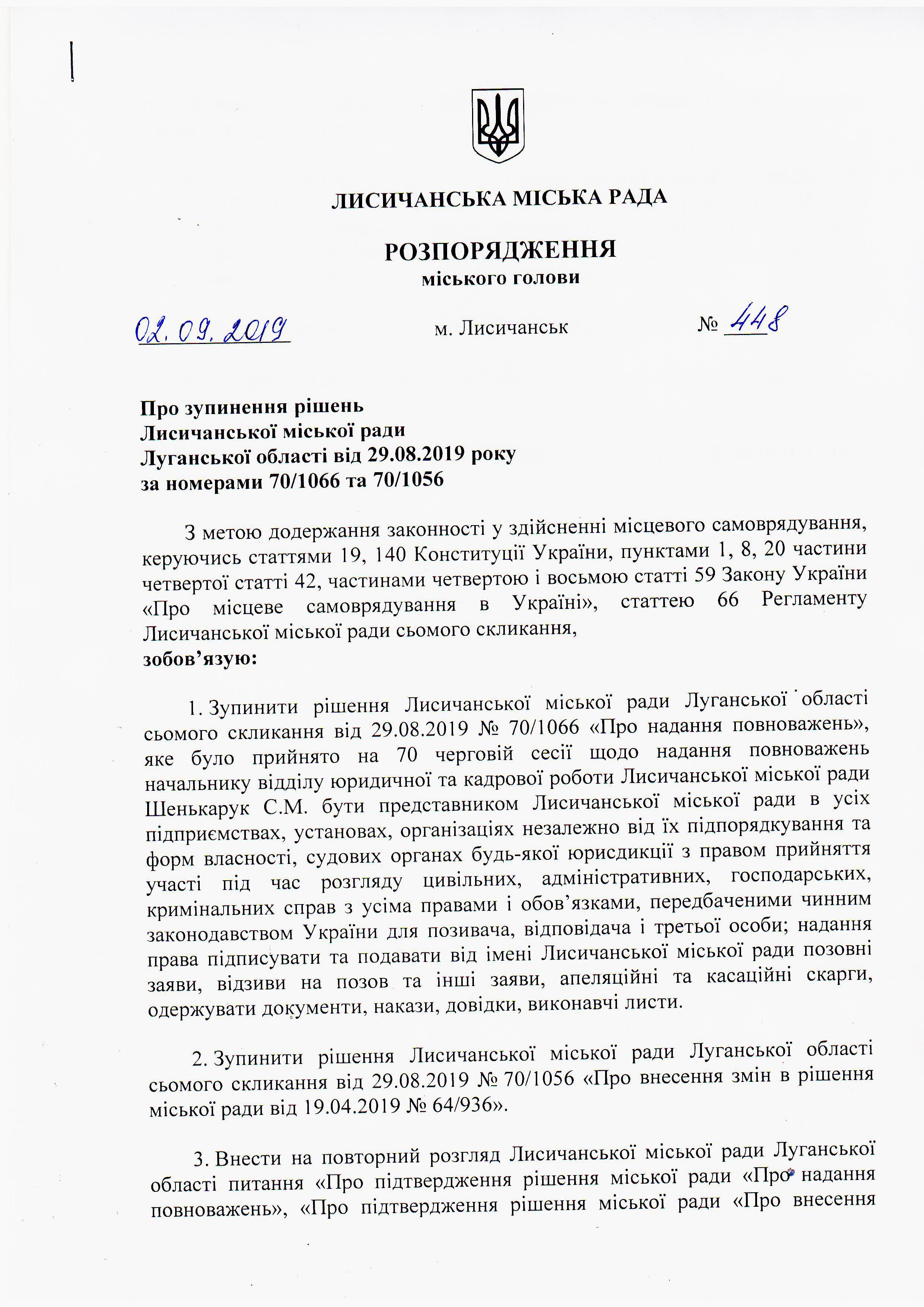 В частности, Шилин распорядился остановить действие решения № 70/1066 от 29 августа о предоставлении полномочий начальнику отдела юридической и кадровой работы Лисичанского горсовета С.Шенькарук быть представителем Лисичанского горсовета во всех предприятиях, учреждениях, организациях, судах, а также подписывать и подавать от имени Лисичанского горсовета иски, жалобы, получать документы, приказы, справки, исполнительные листы.