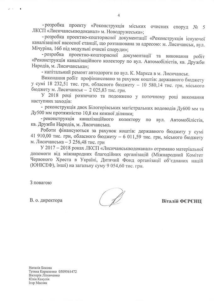 "Месяц назад несколько лисичанских депутатов обратилось к главе Луганской ОГА по нескольким проблемным вопросам. Встречи так и не получилось, зато получили письма - вот такая односторонняя связь. По Лисичанскводоканалу смысл такой, что мы (область) сделали все, а вы ничего. Все - это перечень поручений, типа лучше работать с платежами, повысить тариф и т.д.", - отметила Машута.