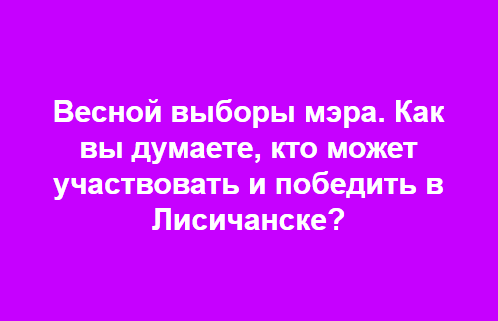 В одном из региональных пабликов сегодня, 16 сентября, запущен опрос относительно кандидатуры будущего мэра Лисичанска, сообщает Час Пик. «Как вы думаете, кто может участвовать и победить в Лисичанске?», - такой вопрос выставлен для комментирования.