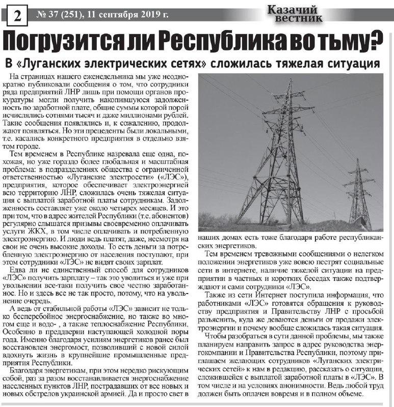 О тяжелой ситуации в энергетическом секторе так называемой "республики" говорится в статье, опубликованной в местной газете "Казачий вестник", передает Час Пик.