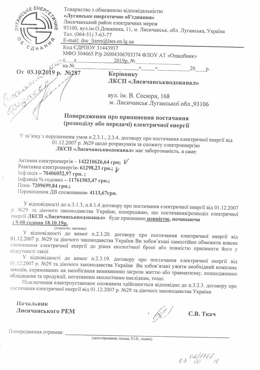 Еще одно предупреждение водоканал получил от ООО "Луганское энергетическое объединение". Согласно этому документу, "Лисичанскводоканал" должны обесточить в 9:00 часов 18 октября. Причина отключения - долг водоканала за электроэнергию в размере более 167 млн. грн.