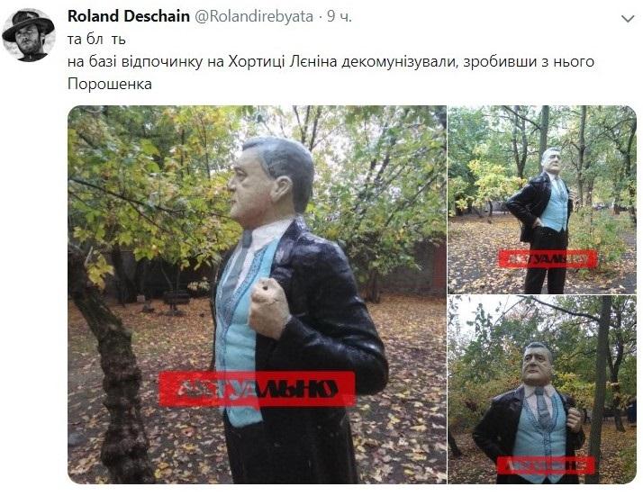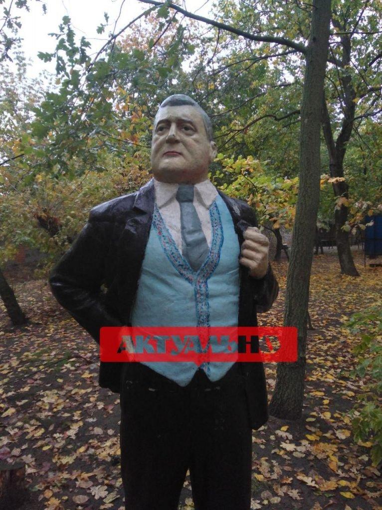 На кадрах видно, что памятник раскрасили, “одев” на него черный костюм с гербом Украины. Лицо попытались сделать похожим на Петра Порошенко. Место размещения обновленного памятника – база отдыха “Скиф”, которая расположена в районе “Волна” напротив острова Хортица.