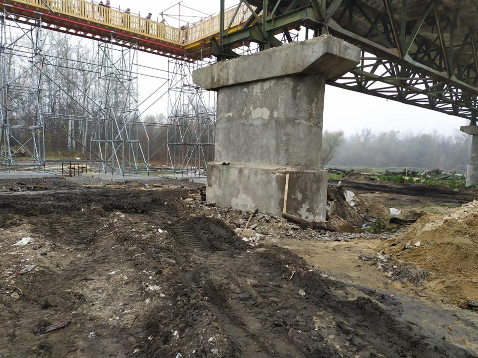 Рабочие начали отсыпку щебеночного основания для установления железобетонных плит, которые будут фундаментом для третьей временной промежуточной опоры пролета восстанавливаемого моста. После чего устанавливали сами плиты.