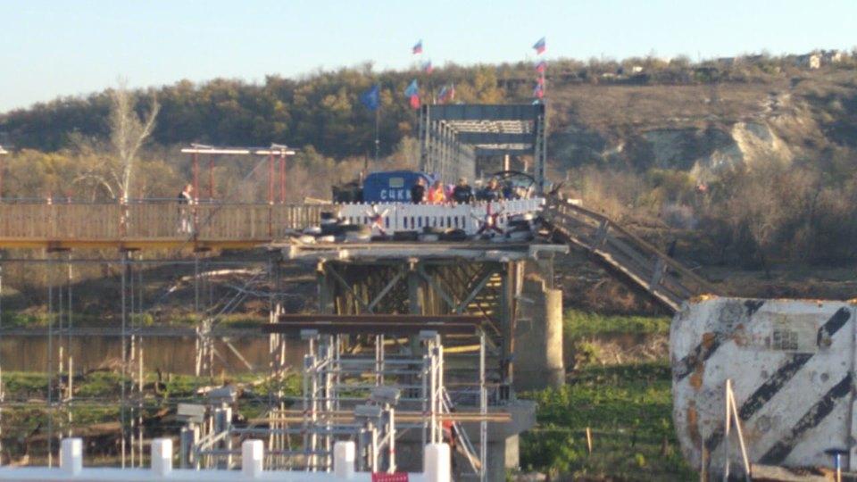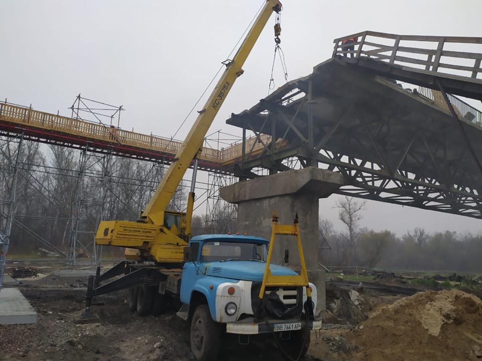 В Станице Луганской проходит монтаж третьей временной промежуточной опоры пролета восстанавливаемого моста.