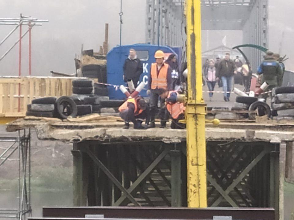 Для продолжения работ по восстановлению пролета моста прибыли десять представители ООО "Укртрансмост". К этим работам была задействована специальная техника: бортовая газель, автокран и автоподъемник.