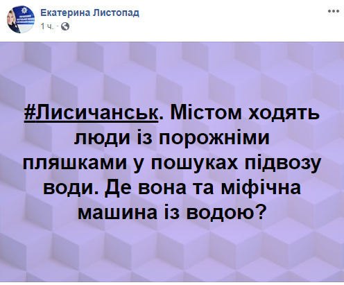 Депутат Лисичанского горсовета Юлия Машута сообщила, что воду подвозят всего 5 машин, воды на всех не хватает.