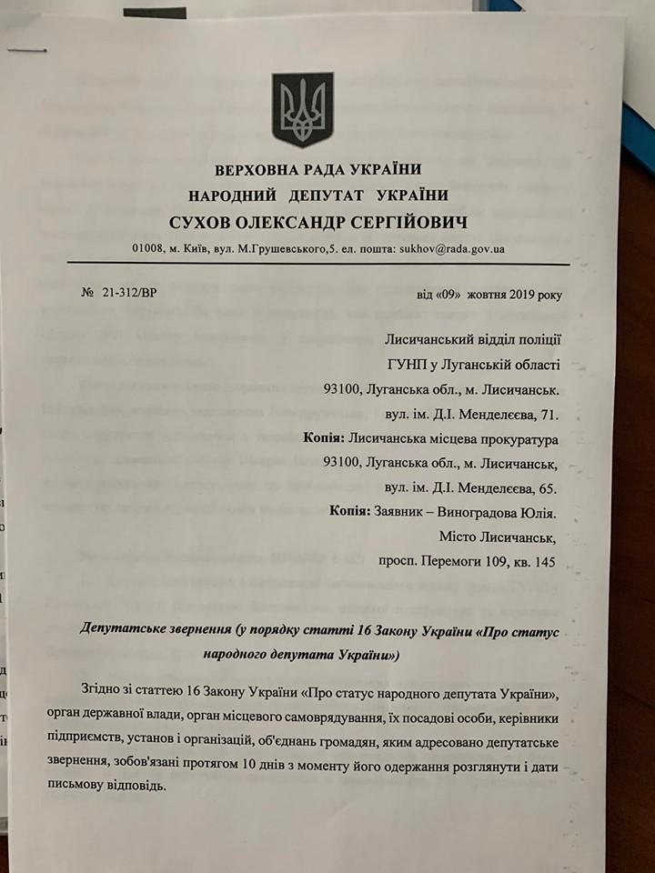 Сухов приглашает местных жителей также прийти на встречу с руководством лисичанской полиции и руководителем Лисичанской местной прокуратуры Виктором Лазуренко, которая состоится 23 октября в 10:00 в Лисичанской местной прокуратуре.