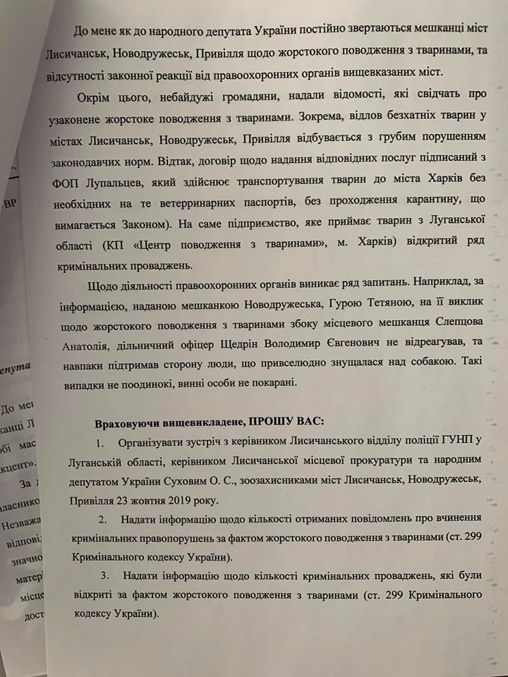 Как отмечает Сухов в своем депутатском обращении, неравнодушные жители сообщают об узаконенном жестоком обращении с животными. Отлов бездомных животных в Лисичанске, Новодружеске и Приволье происходит с грубым нарушением законодательства. Животных транспортируют в Харьков без ветеринарных паспортов и прохождения карантина. На само предприятие, которое принимает животных из Луганской области, открыт ряд уголовных производств, сообщает Сухов.