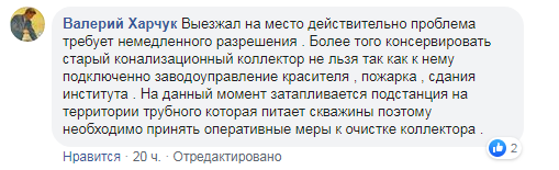 "Как я понимаю, это территория частного предприятия, и чтобы попасть туда - нужно согласование с руководством. Но как раз замена коллектора, где вы выступали в качестве спикера, и должна решить эту проблему, но если вы договоритесь о доступе на место аварии, то готов выехать и привлекать все возможные ресурсы для устранения последствий", - пишет Харчук.
