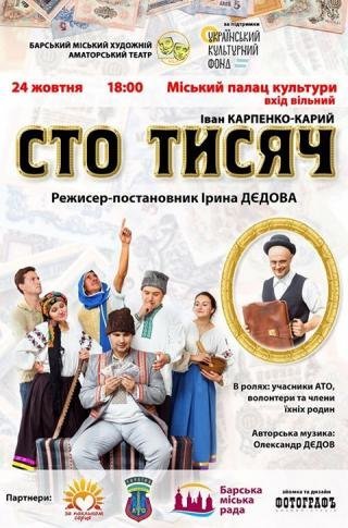 В Северодонецке Луганской области покажут спектакль по известной пьесе Ивана Карпенко-Карова "Сто тысяч". Представление состоится 24 октября, в 18:00, в Городском дворце культуры.