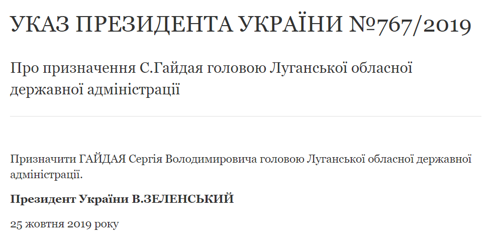 На освободившее кресло другим указом президент Украины назначил Сергея Гайдая. Его кандидатуру согласовали еще 20 октября. 26 октября Зеленский отправился в Северодонецк, где представит Гайдая на новой должности.