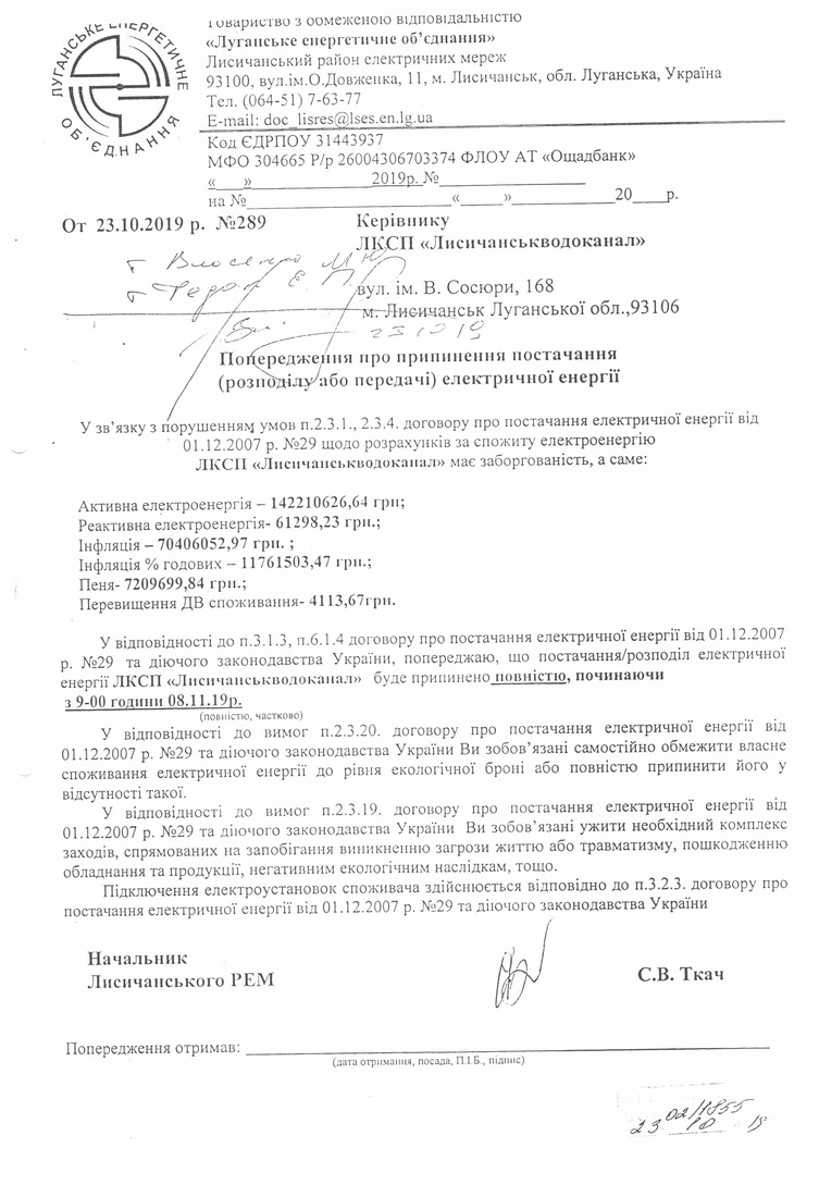 Но компания-распределитель электроэнергии "Луганское энергетическое объединение" все еще ждет погашения многомиллионных долгов водоканалом и намерена обесточить объекты предприятия в пятницу, 8 ноября. Соответствующее предупреждение "Лисичанскводоканал" получил еще 23 октября.