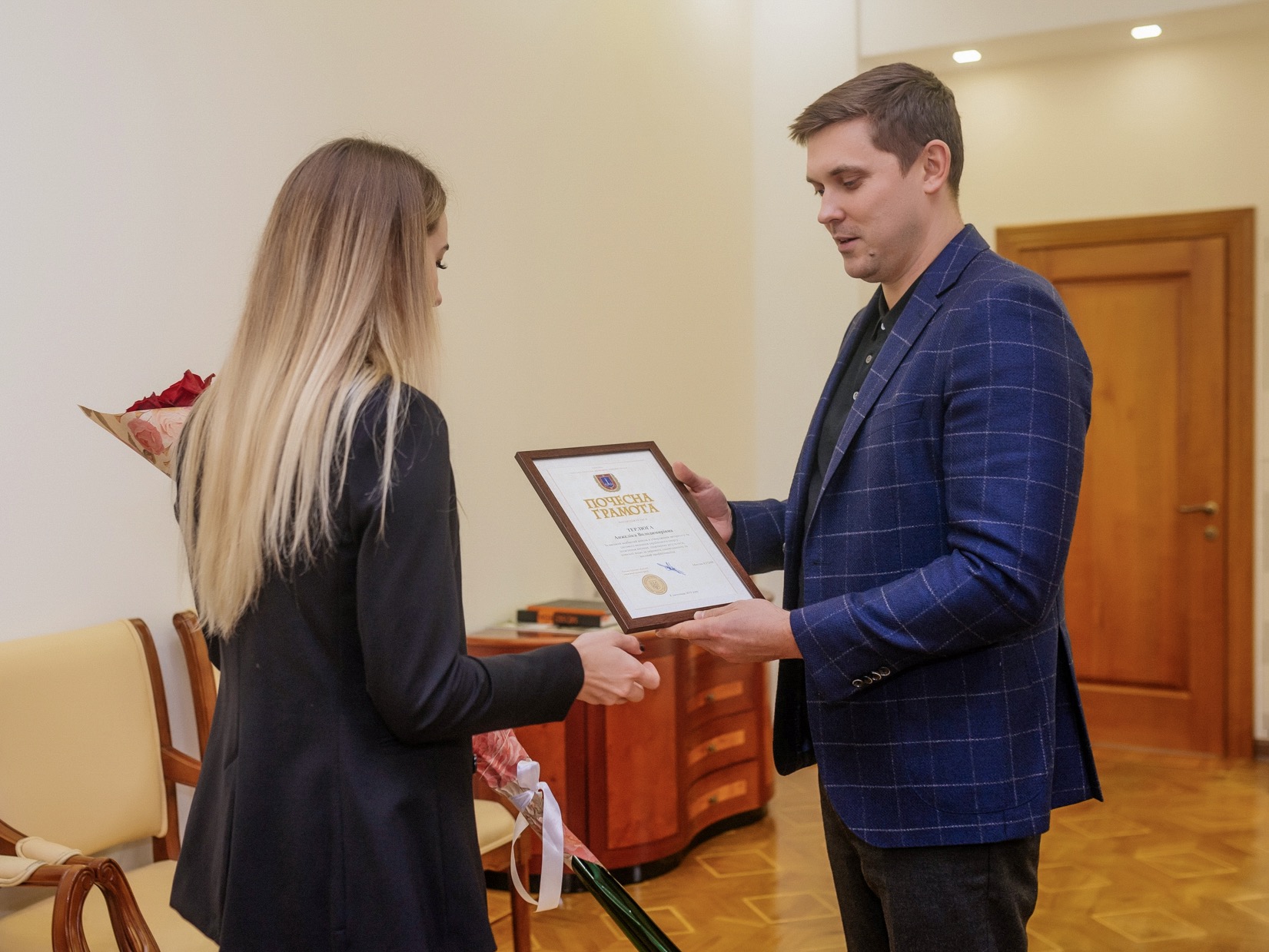 В пятницу, 8 ноября, глава Одесской области Максим Куцый в торжественной обстановке наградил почетной грамотой лучшую каратистку мира, в весе 55 кг, Анжелику Терлюгу.