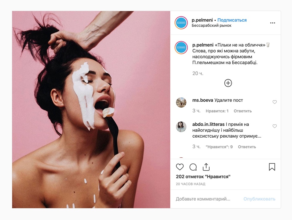 В социальной сети разгорелся скандал вокруг провокационной рекламы заведения "П.Пельмени". Киевское заведение возмутило пользователей Интернета своей сексистской рекламой в Instagram.