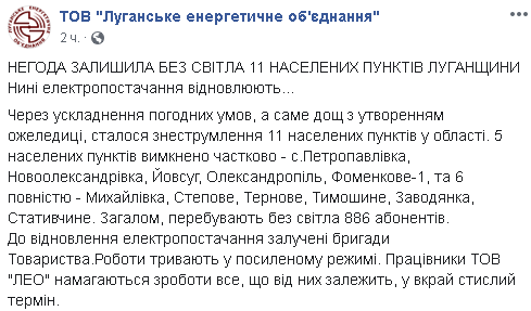 Об этом сообщает ООО "Луганское энергетическое объединение" в Фейсбук, передает Час Пик.