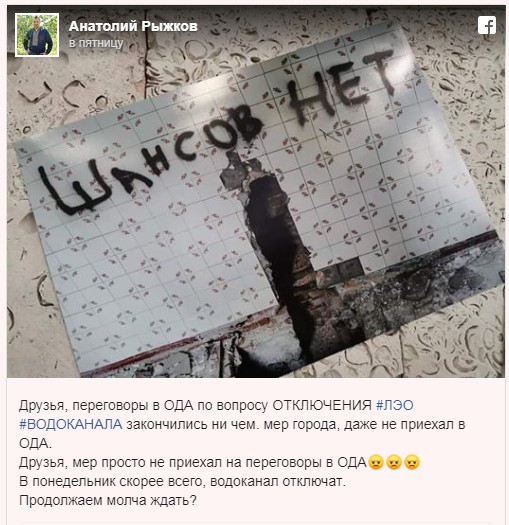 Общественный активист Анатолий Рыжков из Лисичанска на своей странице в Facebook призывает всех, кому не безразлична судьба города, поговорить о сложившейся ситуации с водоканалом на сегодняшний день. Лисичане в комментариях отмечают, что взволнованы тем, что отключение воды может привести к более тяжелым последствиям.
