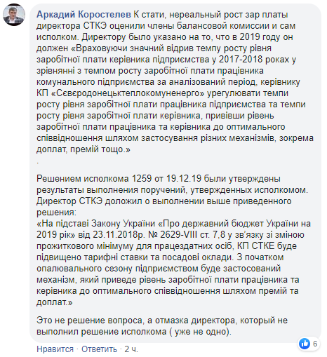 Как отметил в комментариях в одной из местных групп Аркадий Коростелев, решением № 4406 от 19 декабря «Про внесення змін до міського бюджету м.Сєвєродонецька на 2019 рік» осуществлен рост расходов на финансовую помощь СТКЭ, руководитель которого имеет одну из самых больших зарплат среди бюджетников и коммунальных предприятий города, но предприятие убыточно. Поэтому СТКЭ нуждается в помощи горожан не только через оплату тарифа, но и получило очередную помощь из бюджета в сумме 4 499 129 грн на «Погашення заборгованості за спожиту електричну енергію (КП "СТКЕ"). Всего за 2019 год предприятие получило 19,1 млн грн финансовой поддержки из бюджета. Коростелев предполагает, что к Новому году средства на выплату зарплат найдутся.