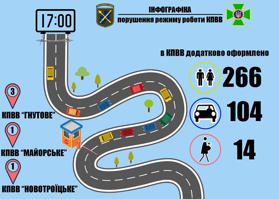 Известны 5 случаев, когда после 17.00 с временно оккупированной территории Украины прибывало значительное количество граждан и автомобилей. Учитывая темное время суток и потенциальную опасность, исходящая от систематического нарушения режима "тишины" российскими вооруженными формированиями, по решению Командующего объединенных сил работу указанных КПВВ было продолжено.