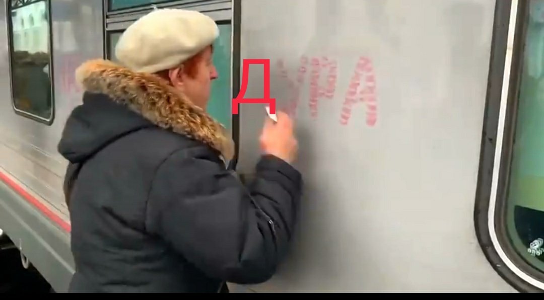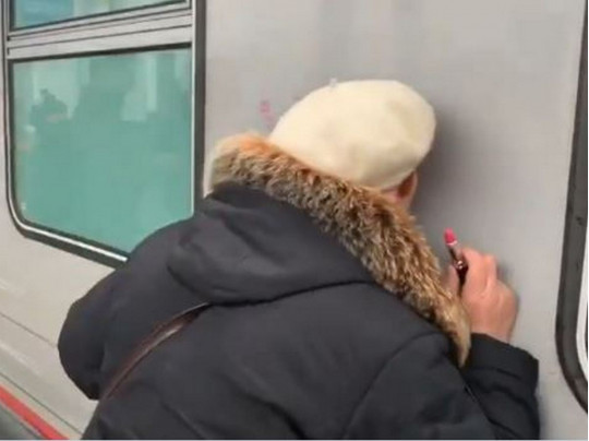 Женщина расцеловала один из вагонов. По следам от губной помады видно, что она "нарисовала" на поезде слово "ура". Это пенсионерка сделала, целуя транспорт сообщением из России в оккупированный Крым.