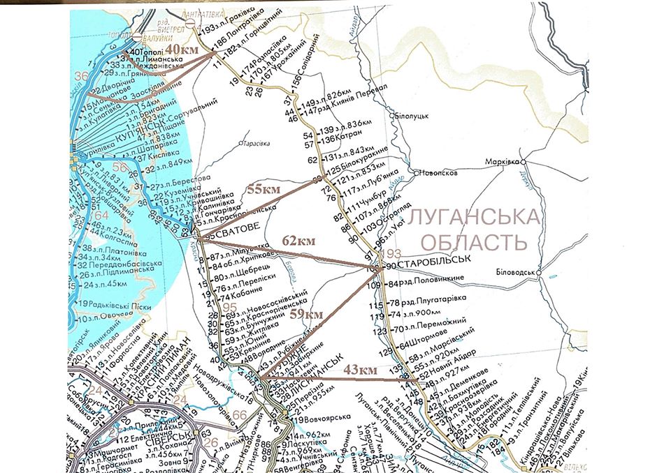 Направление Рубежное - Новый Айдар кратчайший, однако имеет усложненный профиль местности, требует строительства мостового перехода через пойму р. Айдар и проходит в стратегической близости к линии разграничения.