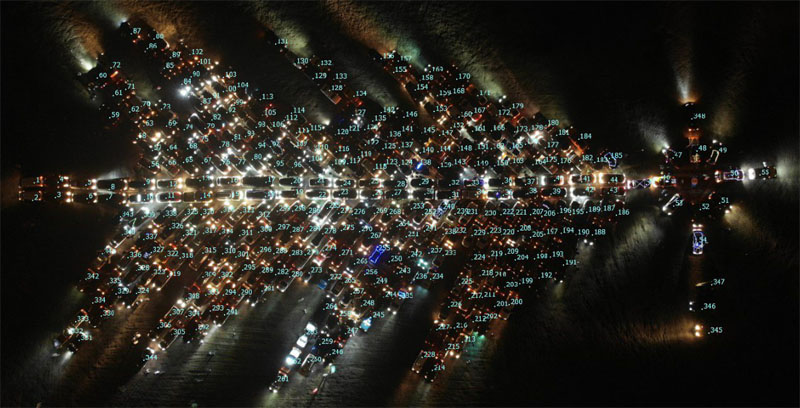 Владельцы 348 автомобилей, из которых состояла автоелка, включили фары и другое световое оформление. Издалека их творение переливалоь огнями, как настоящая новогодняя елка.