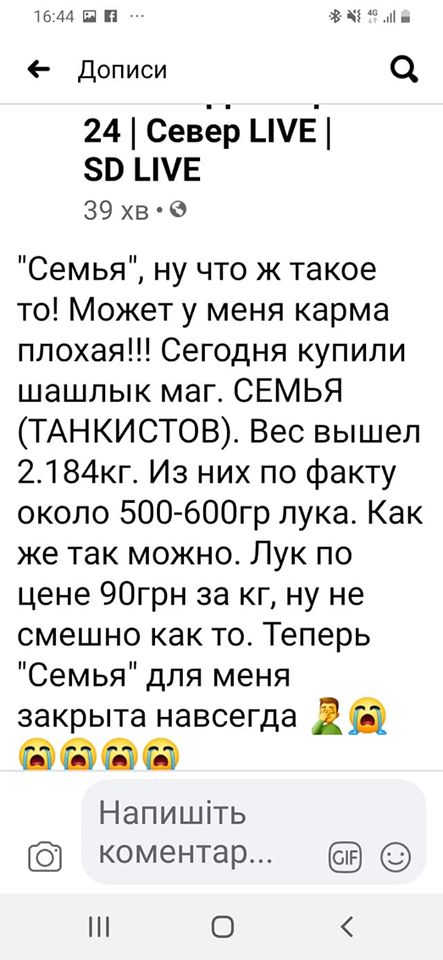 Жители Северодонецка снова дискутируют о купленной еде в супермаркете "Семья". На этот раз покупателя возмутил слишком дорогой, по его мнению, шашлык.