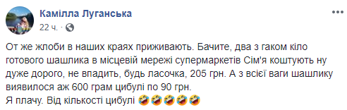 В местном паблике пользователь жалуется, что в более чем 2 килограммах готового шашлыка - около 500-600 грамм лука. Товар стоил 205 гривен (93 грн за кг).