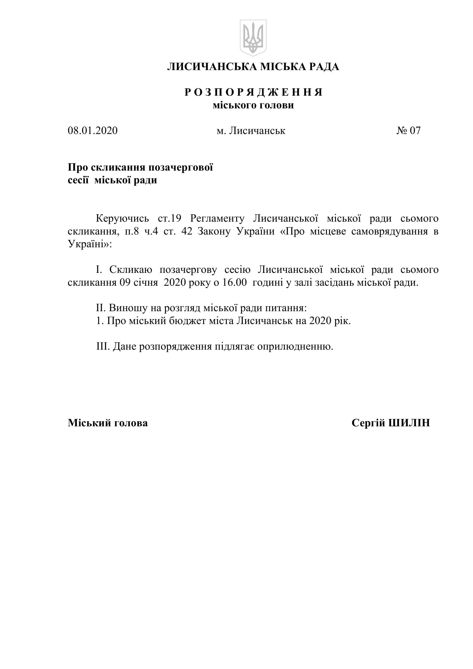 "Заседание внеочередной 82-й сессии Лисичанского городского совета седьмого созыва состоится 9 января 2020 года в 16.00 в зале заседаний городского совета.