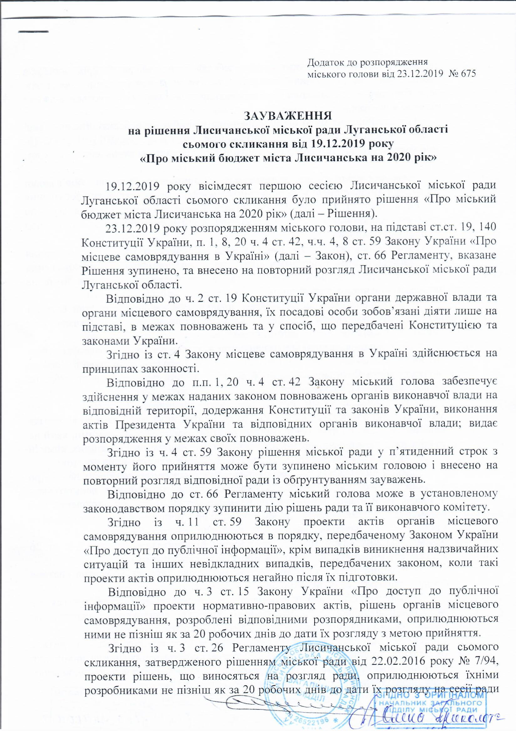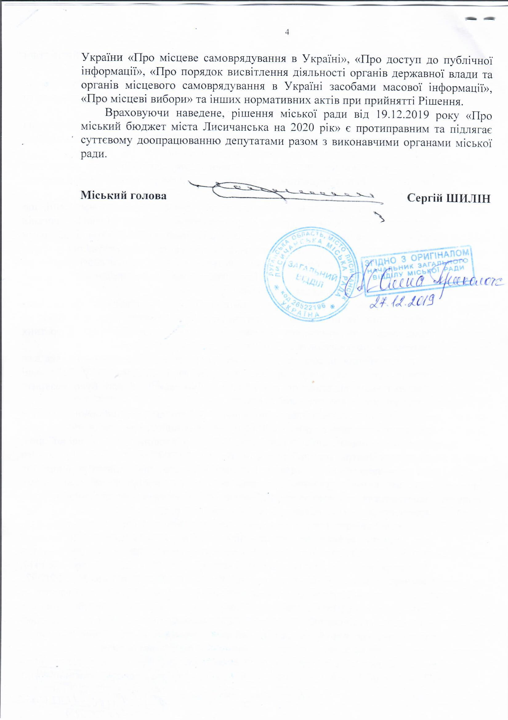 Принятый в декабре городской бюджет Лисичанска Шилин ветировал и потребовал его доработки. Городской голова заявляет, что в принятом проекте бюджета вообще не предусмотрены расходы на: внедрение системы электронного документооборота, освещение деятельности горсовета в СМИ, покупку компьтерной и оргтехники, программного обеспечения, приобретение видеокамер для городской системы видеонаблюдения, метериально-техническое обеспечение работы городской избирательной комиссии и проведение местных выборов в 2020 году, перезарядку онетушителей, замену электропроводки, ремонт служебных кабинетов и автомобилей, мебель, канцтовары, инвентарь и др.