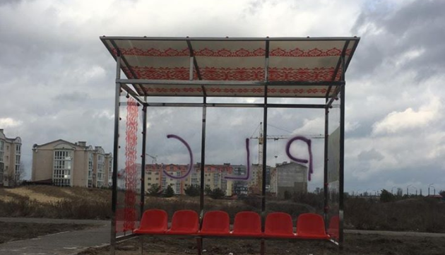 Сколько может простоять новая остановка, пока ее кто-то не изгадит? Как показывает практика Северодонецка, - около месяца. На остановке с национальным орнаментом, которую поставили перед новым годом, появилась надпись.