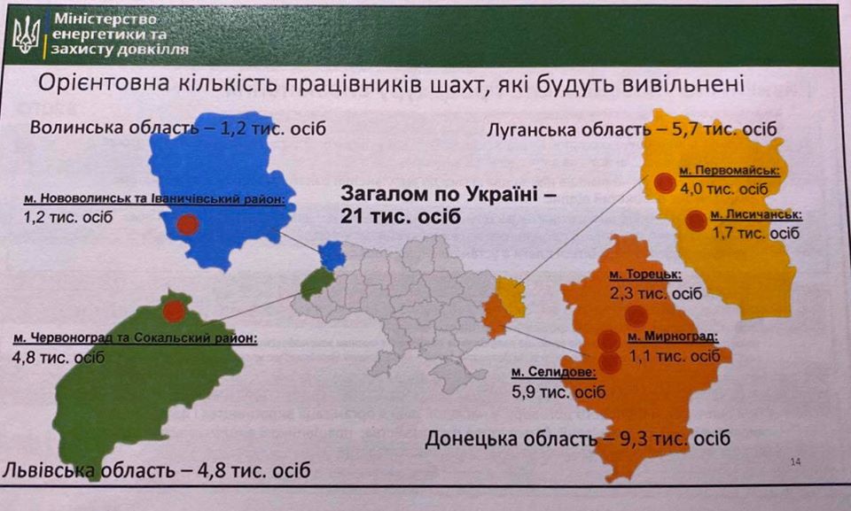 Так, на Луганщине планируется уволить 5700 работников шахт (из 8018 трудоустроенных сегодня), из них на ПАО "Лисичанскуголь" - 1700 человек, на ГП "Первомайскуголь" - 4000 человек.