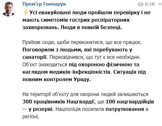 Премьер заявил, что ситуация в санатории стабильная. Все эвакуированные прошли проверку и не имеют симптомов острых респираторных заболеваний. Он также отметил, что у них есть все необходимое.