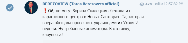 Зоряна Скалецкая заявила о том, что она проведёт эти 14 дней вместе с эвакуированными с Уханя людьми. Однако, как сообщается, сегодня она покинула санаторий в Новых Санжарах.
