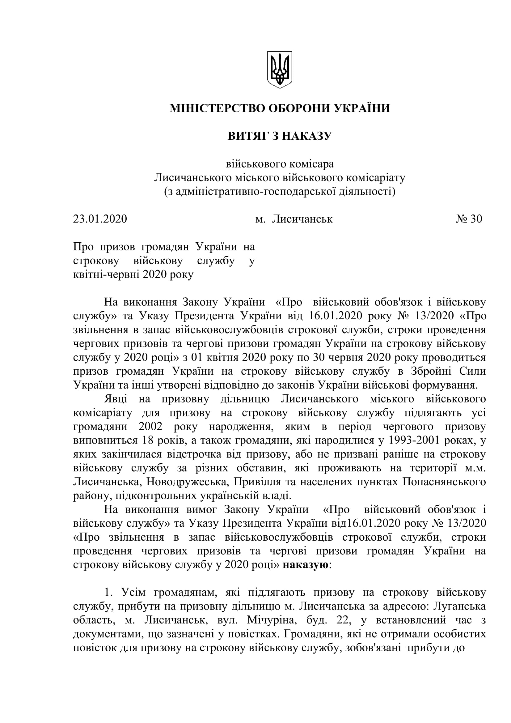 Всем гражданам, которые подлежат призыву на срочную военную службу, приказано прибыть на призывной участок г. Лисичанска по адресу: Луганская область, г. Лисичанск, ул. Мичурина, д. 22, в установленное время с документами, указанными в повестках. Граждане, не получившие личных повесток для призыва на срочную военную службу, обязаны прибыть в Лисичанский городской военный комиссариат в десятидневный срок со дня начала призыва на срочную военную службу, а именно до 10 апреля 2020 года, и иметь при себе документы, удостоверяющие личность.