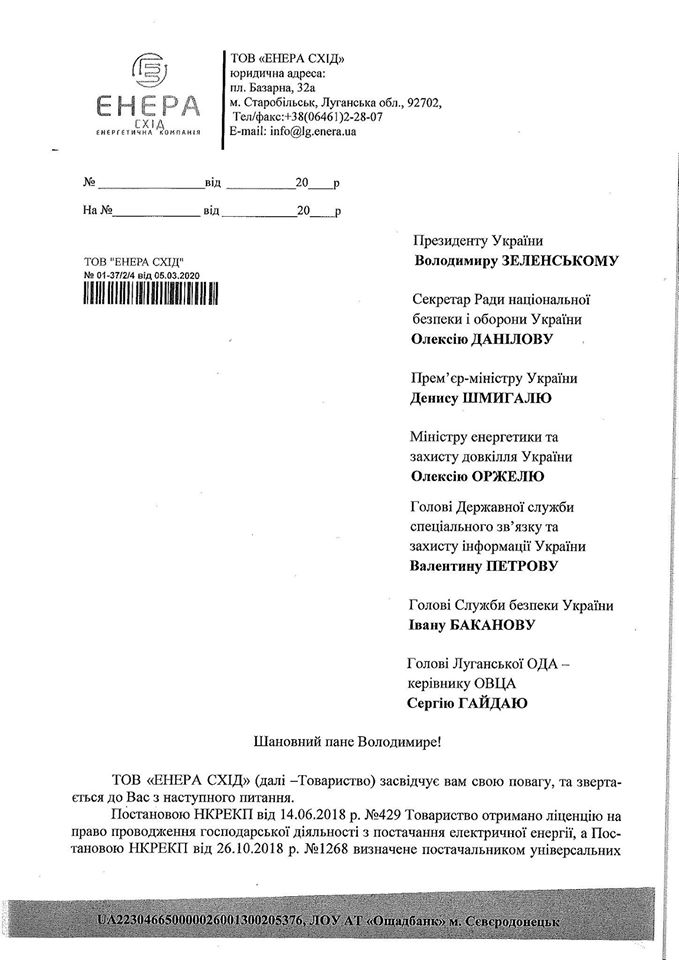 ООО "ЕНЕРА СХІД" уже направила обращение к Президенту Украины и ООО "ЛЭО", которое, в свою очередь, предупредило Луганский филиал Концерна РРТ об угрозе обесточивания.