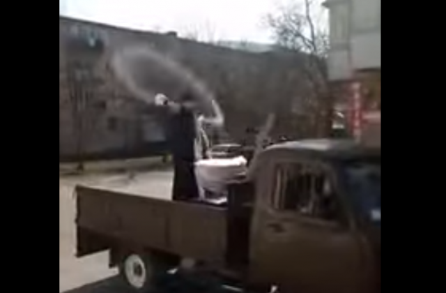 На видео, которое выложили в YouTube, видно, что по улицам населенного пункта едет автомобиль УАЗ, в кузове которого стоит батюшка и окропляет святой водой улицу. Весь процесс сопровождается звоном церковных колоколов.