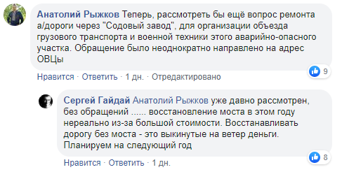 "Восстановление моста в этом году нереально из-за большой стоимости. Восстанавливать дорогу без моста - это выкинутые на ветер деньги. Планируем на следующий год", - заявил Гайдай в ответ на комментарий в Фейсбуке.