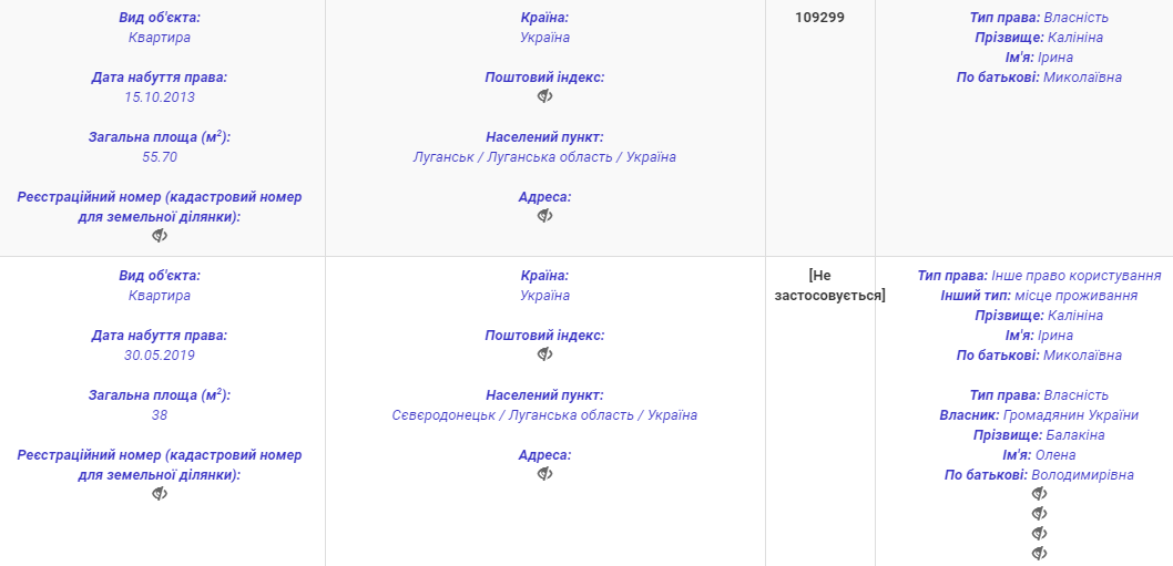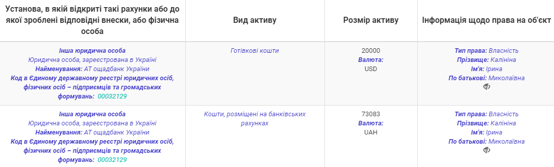 В ежегодной декларации за 2019 год, поданной 13 марта 2020 года, Калинина указала 854 629 грн. зарплаты по основному месту работы. Также она получила 5062 грн. помощи как внутренне перемещенное лицо. Из имущества у чиновницы - квартира в Луганске площадью 55,7 кв. м, стоимостью 109 299 грн. На банковских счетах - 20 тыс. долларов и 73 тыс. грн.