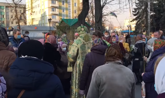 Действо проходило на улице, однако не все священнослужители и прихожане имели средства индивидуальной защиты - маски и перчатки, к тому же люди толпились, явно игнорируя требования соблюдать социальную дистанцию в 1,5 метра.