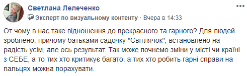 "Вот почему у нас такое отношение к прекрасному и хорошему? Для людей сделано, причем родителями садика "Светлячок", установлено на радость всем, но вот результат. Так может начнем изменения в городе или стране с СЕБЯ, а то тех кто критикует много, а тех кто делает хорошие дела по пальцам можно сосчитать", - пишет автор поста.