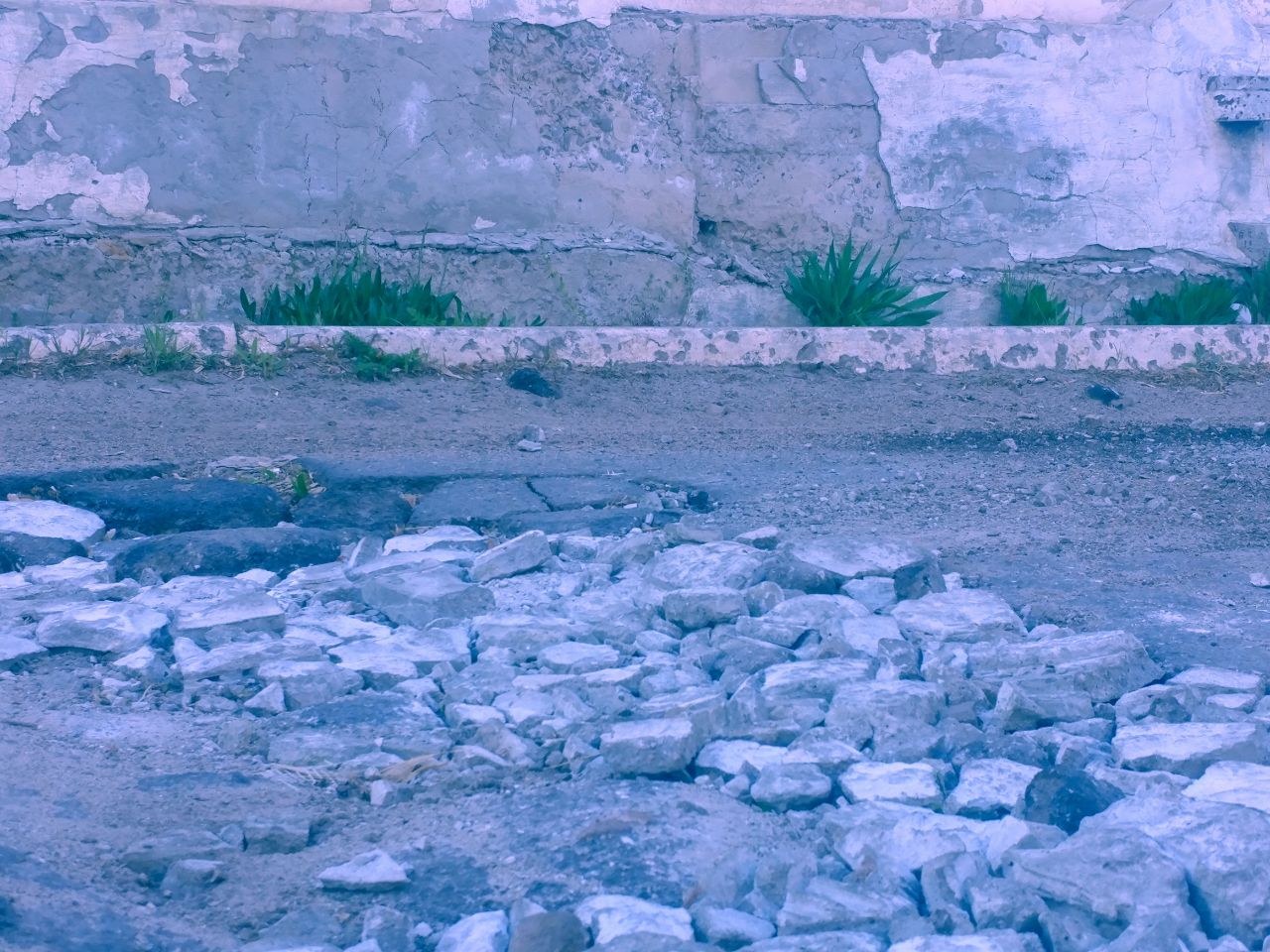Едва ли после такой импровизации дорога стала лучше: несокрушимые куски бетона заводской стены разнеслись за пределы ям и просто лежат на дороге, препятствуя нормальной езде.