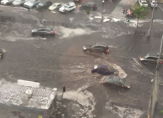 Днем 4 мая на столицу Украины обрушился мощный ливень с грозой, в результате чего на улицах образовались реки.