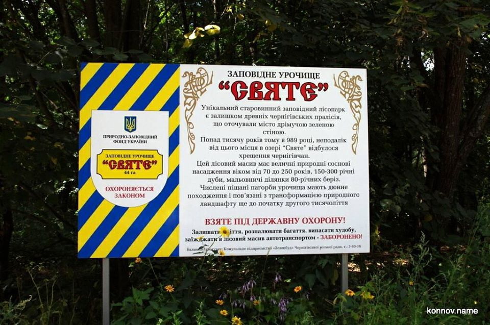 Озеро находится на территории заповедного урочища "Святое", которое является остатком древних черниговских пралесов, которые окружали город дремучей зеленой стеной. Там до сих пор растут сосны возрастом от 70 до 250 лет, 150-300-летние дубы, 80-летние березы.