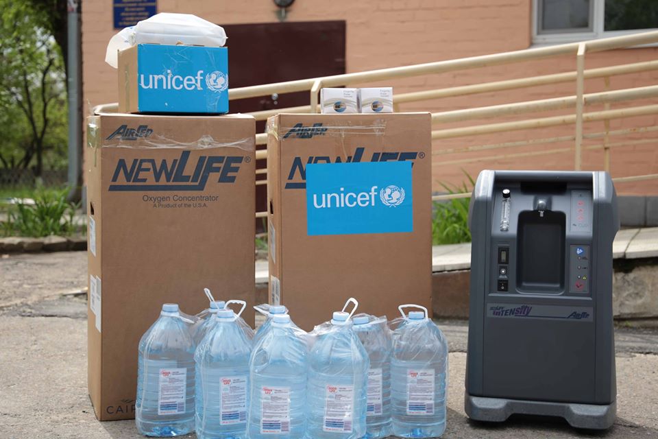 Сегодня Детским фондом ООН (ЮНИСЕФ) была передана помощь трем больницам в городах Рубежном, Старобельске и Северодонецке Луганской области, состоящая из 8 кислородных концентраторов, 30 пульсоксиметров и стратегического запаса бутилированной воды более 30 000 литров.