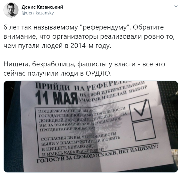 Журналист Денис Казанский опубликовал в Твиттере интересную "агитку", которую распространяли организаторы "референдума" в 2014-м. Автор твита резонно отметил, что сепаратисты реализовали на Донбассе ровно то, чем пугали людей в 2014-м году: обещанных "экономического и социального процветания" не видно даже в перспетиве, зато есть нищета, безработица, фашисты у власти.