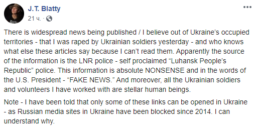 Боевики сообщили, что в Станично-Луганском районе нацгвардейцы якобы задержали авто, в котором ехала Туэра Блатти. Водителя уличили в употреблении спиртного, а саму журналистку доставили в пункт размещения нацгвардейцев, где ее якобы напоили и изнасиловали.