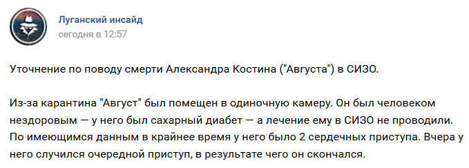 В СИЗО оккупированного Луганска умер один из опальных командиров боевиков "ЛНР", бывший главарь банды "Призрак" и подельник убитого Алексея Мозгового, Александр Костин по кличке "Август".