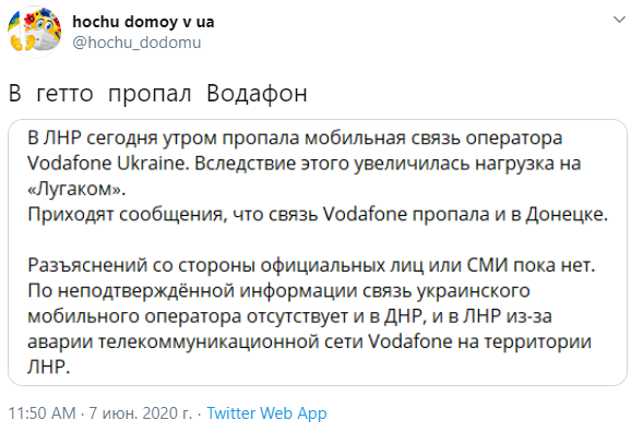 "Разъяснения со стороны официальных лиц или СМИ пока нет. По неподтвержденной информации связь украинского мобильного оператора отсутствует и в ДНР, и в ЛНР из-за аварии телекоммуникационной сети Vodafone на территории ЛНР", - говорится в публикации.