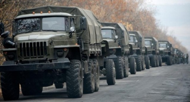 В 20:40 было обнаружено 12, вероятно, грузовиков военного типа и сопроводительную универсальную легкую машину, которые стояли автоколонной на грунтовой дороге развернутые на восток, а также 5 человек, которые ходили между грузовиками.